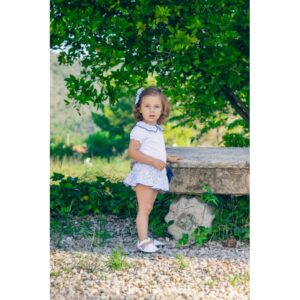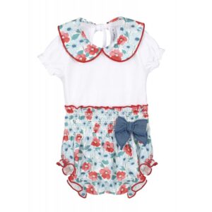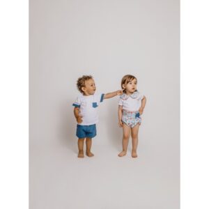 - Conjunto corto para bebé niña compuesto por camiseta manga corta cuello bebé y pololo estampado floral detalle lazo Medma Composición: 100% Algodón Color: Blanco/Azul Costuras vistas a tono Costuras vistas a tono Marca: Calamaro Baby Fabricado en España