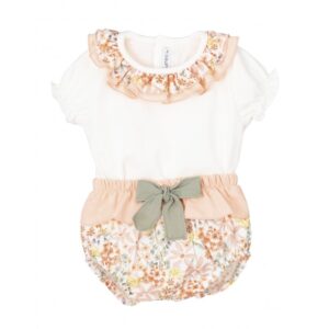 - Conjunto pololo Lete Camiseta cuello volante, pololo estampado floral detalle lazo Color: Melocotón Composición: 100% Algodón Fabricado en España Marca: Calamaro Baby