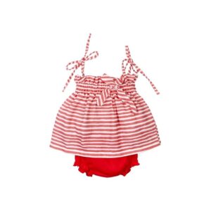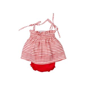 - Conunto corto de algodón de dos piezas para bebé niña compuesto por vestido tirante fino de rayas detalle lacito y cubrepañal liso Color: Rojo Costuras vistas a tono Marca: Tony Bambino Fabricado en España. Moda nacional al mejor precio envio 24/48 horas
