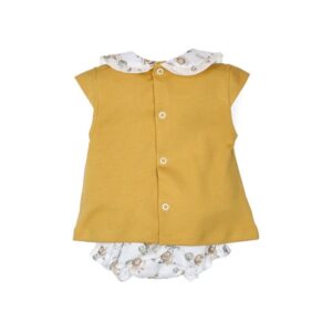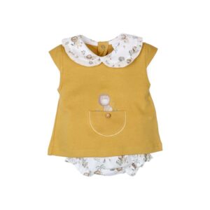 - Conjunto corto de dos piezas para bebé niña, formado por camiseta de algodón y cubrepañal en tejido estampado Color: Mostaza Costuras vistas a tono Marca: Tony Bambino Fabricado en España. Moda nacional al mejor precio envio 24/48horas