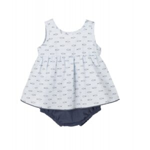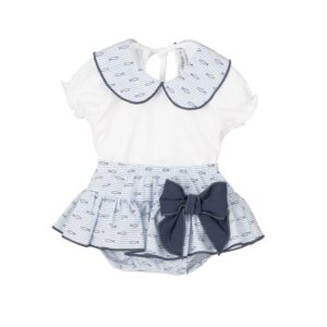 - Conjunto pololo Alsine para bebé niña Precioso conjunto compuesto por pololo con volante estampado peces detalle lazo y camiseta lisa blanca de manga corta Presentado en caja Fabricado en España Composición: 100% Algodón Color: Blanco/Azul Costuras vistas a tono Marca: Calamaro Baby
