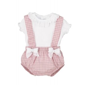 - Conjunto de 2 piezas de algodón para bebé niña compuesto por: Camiseta tirante fino detalle nido de abeja y cubrepañal con estampado de cuadros vichy Color: Blanco/Rosa Costuras vistas a tono Marca: Tony Bambino Fabricado en España. Moda nacional al mejor precio envios en 24 / 48 horas