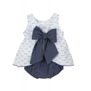 - Conjunto bebé niña Medma, compuesto por: Jesusito tirante ancho estampado flores, detalle lazo y cubrepañal liso Composición: 100% Algodón Color: Azul Costuras vistas a tono Fabricado en España Marca: Calamaro Baby envios 24 / 48 horas