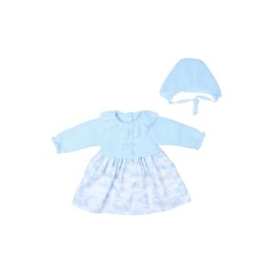 - Conjunto de 3 piezas para bebé niña compuesto por: Vestido de manga larga confeccionado en tejido combinado de punto y tela con cuello volante y cubrepañal y gorro de punto Color: Azul Costuras vistas a tono Marca: Tony Bambino Fabricado en España