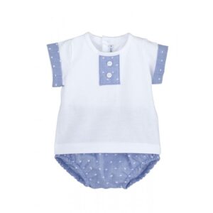 - Conjunto corto para bebé niño baratti Compuesto por camiseta manga corta cuello redondo y pololo Color: Blanco/Azul Costuras vistas a tono Composición: 100% ALGODÓN Fabricado en España Marca: Calamaro Baby Envío en 24/48 horas