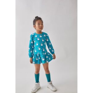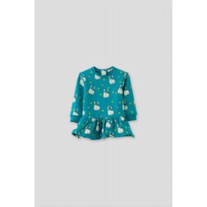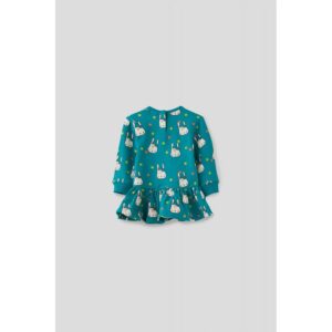 - Vestido de algodón manga larga para bebé niña estampado con cuello redondo y bajo volante Conejitos Color: Cyan Costuras vistas a tono Composición: 95% Algodón 5% Elastano Marca: Street Monkey
