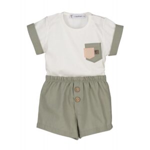 - Conjunto corto Lete Compuesto por camiseta manga corta cuello redondo y pantalón corto Color: Kaki Costuras vistas a tono Composición: 100% Algodón Fabricado en España Marca: Calamaro Baby