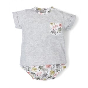 - Conjunto corto bebé niño de 2 piezas Savanna Conjunto corto de dos piezas bebé compuesto por cubrepañal con estampado Savanna y camiseta de manga corta cuello redondo detalle volante Costuras vistas a ton Marca: Popys Fabricado en España