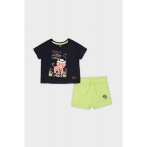 - Conjunto de 2 piezas para bebé niño. Camiseta azul marino de manga corta con estampado en el centro, cierre con botones a presión en la espalda. Pantalón corto verde lima con pequeño estampado en una de las piernas con cintura elástica con cordón ajustable. Composición: 100% algodon Envío en 24/48 horas