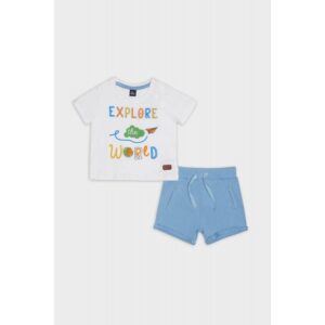 - Conjunto corto de 2 piezas para bebé niño. Camiseta blanca de manga corta con estampado en el centro, cierre con botones a presión en la espalda. Pantalón corto azul royal, con cintura elástica con cordón ajustable. Composición: 100% algodón Envío en 24/48 horas