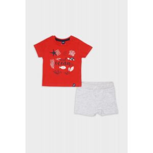 - Conjunto corto de 2 piezas para bebé niño. Camiseta roja de manga corta con estampado en el centro, cierre con botones a presión en la espalda. Pantalón corto gris vigoré, con cintura elástica con cordón ajustable. Tejido suave y elástico, cómodo y fresco para días de verano. Composición: 100% algodón Envío en 24/48 horas
