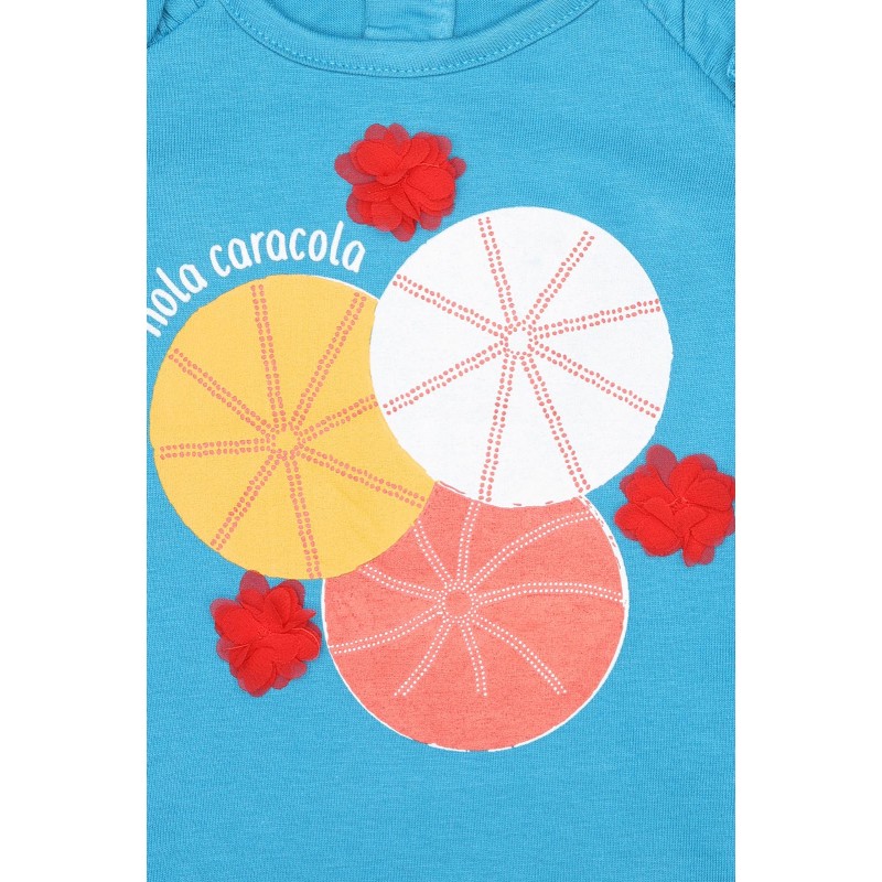 Camiseta azul de manga corta con estampado de flores de tull en el centro, y aplicación de volantes a los lados y cierre con botón.