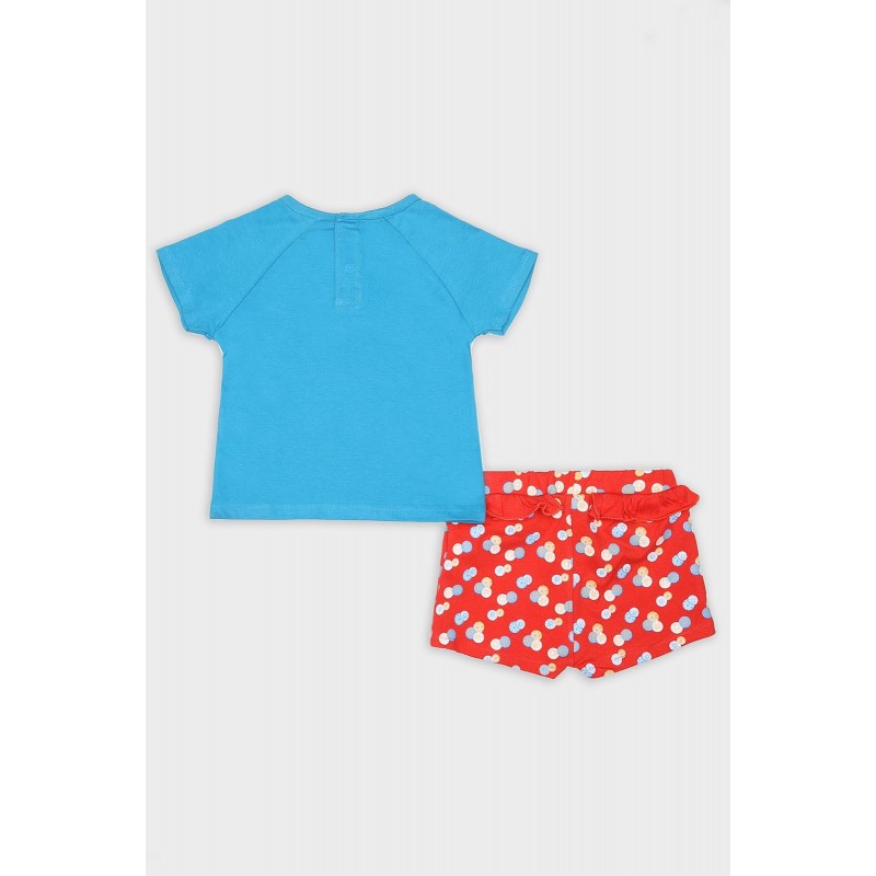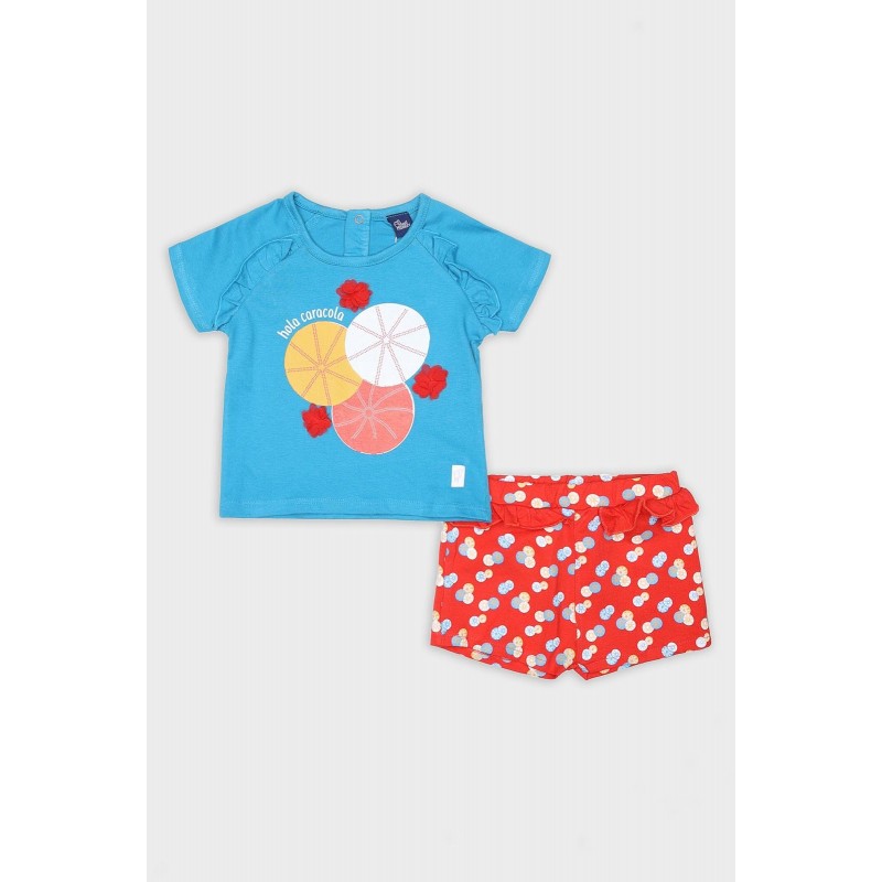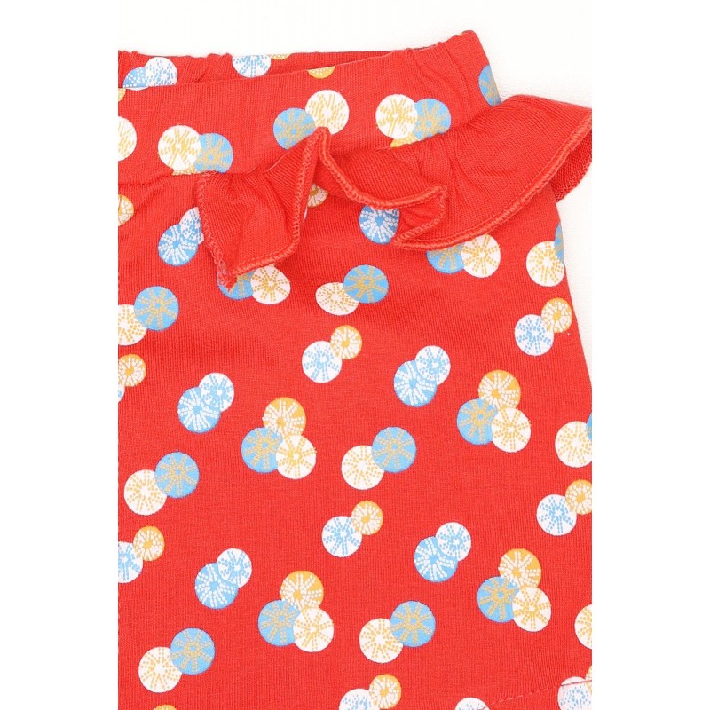 Pantalón corto rojo con estampado de flores en blanco, azul y amarillo con detalle de volantes a los lados y con cinturilla elástica.