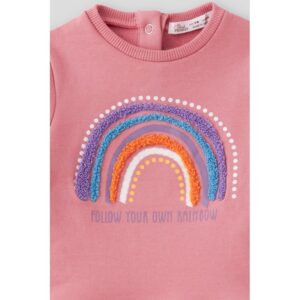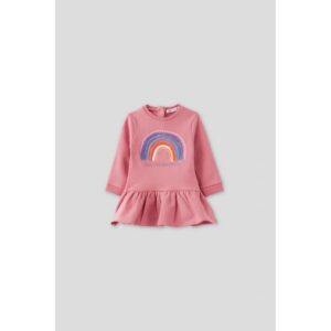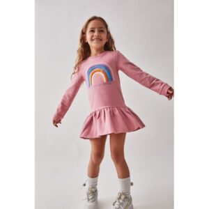 - Vestido de manga larga color maquillaje con cuello redondo. Con un precioso diseño de arcoíris con detalles de colores vibrantes y volantes en el dobladillo, añadiendo un toque femenino y moderno. Confeccionado en un tejido suave y cálido Composición: 95% Algodón 5% Elastano Marca: Street Monkey
